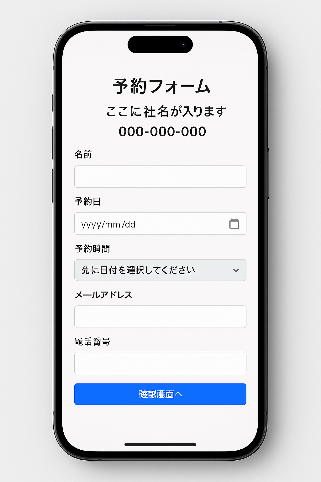 名前・メール・電話番号の必須/任意を設定画面で切り替え可能。
