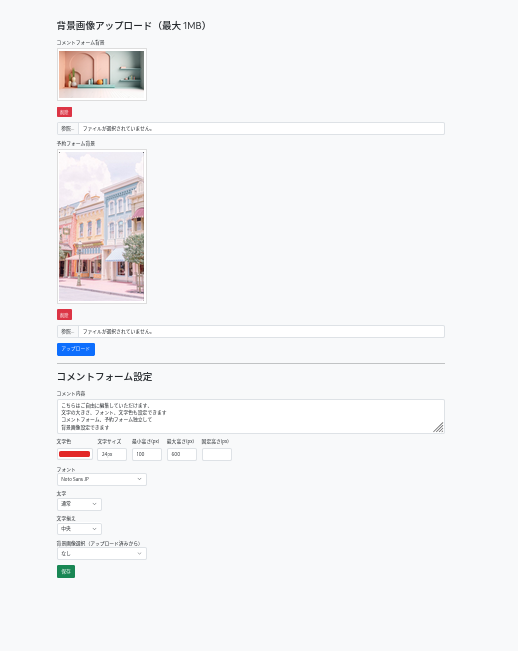 コメントフォームにコメントや営業時間、イベントの案内など自由に編集できます, 背景画像も設定できます。